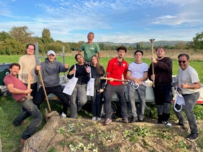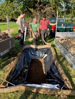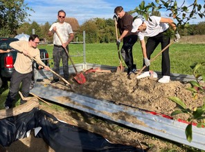 Am 08. Oktober 2025 fand auf dem TRUZ-Gelände zwischen 14:30 und 17:30 Uhr eine Mitmachaktion für Auszubildende der Sparkasse Markgräflerland statt. Hier lernten die sechs Azubis und ihr Anleiter die Biologie und Ökologie von Wildbienen kennen und wie man ihre Fortpflanzung unterstützen kann. Einige Mitarbeiter des TRUZ haben im Vorfeld die Anlage eines Sandariums geplant, das mithilfe der Freiwilligen an diesem Nachmittag gebaut wurde. Bei Apfelsaft und schönem Wetter wurde von einem Teil der Gruppe ein ca. 0,7 m tiefes Loch gegraben, während der andere Teil den Sand zum Auffüllen des Lochs und zur Entwicklung der Sandlinse besorgt hat. Am Ende wurden noch Brombeeräste daraufgelegt, um Katzen fernzuhalten. Anschließend konnten die Azubis dann ihr eigenes Werk bestaunen. Als kleines Dankeschön gab es für jeden einen Jutebeutel vom TRUZ.