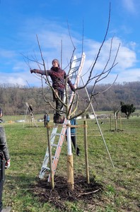 Für die Pflanzung der Hochstämme wurden im Voraus 10 Löcher mit 70 cm Tiefe und einem Durchmesser von knapp 80 cm ausgehoben. Die Wurzeln der Hochstämme wurden in einem Mäuse-Fressschutzkorb zusammen mit Erde und etwas Komposterde verpackt. Dieser wurde dann im Loch mit Erde eingegraben. Holzpfähle wurden in den Boden gerammt, an denen die Hochstämme mit Seilen festgebunden wurden, damit sie gerade wachsen können. Aus den übrigen Grasresten wurde ein Gießrand modelliert, damit die jungen Bäume das Gießwasser möglichst vollständig aufnehmen können.