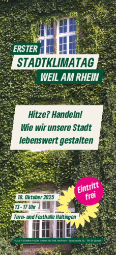 Am Samstag, den 18. Oktober 2025 findet in der Turn- und Festhalle Haltingen (Eimeldinger Weg 40, 79576 Weil am Rhein-Haltingen) der Stadtklimatag Weil am Rhein statt.